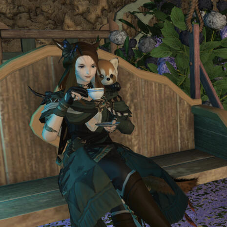 Adopted at a young age by a wealthy Sharlayan family, treated well if rather strictly. Until she snuck into her father's study and read some of his books, finding out more than she anticipated. What she read set her on a journey to find wisdom and truth, steering her towards the stories of Bards and Scholars, who carry wisdom in the form of song, and truth in the form of books. She first left home to take part in the Eureka Expedition. At almost the beginning of her journey there, she found an injured lesser panda that she adopted, nursed back to health, and nick-named Little Buddy. Soon, she would start meeting her chosen family. Many adventurers promised their blades and brains in her search and in life, but few have kept that promise. These days, she much prefers the casual company of friends in her garden to that of any band of adventurers in battle.